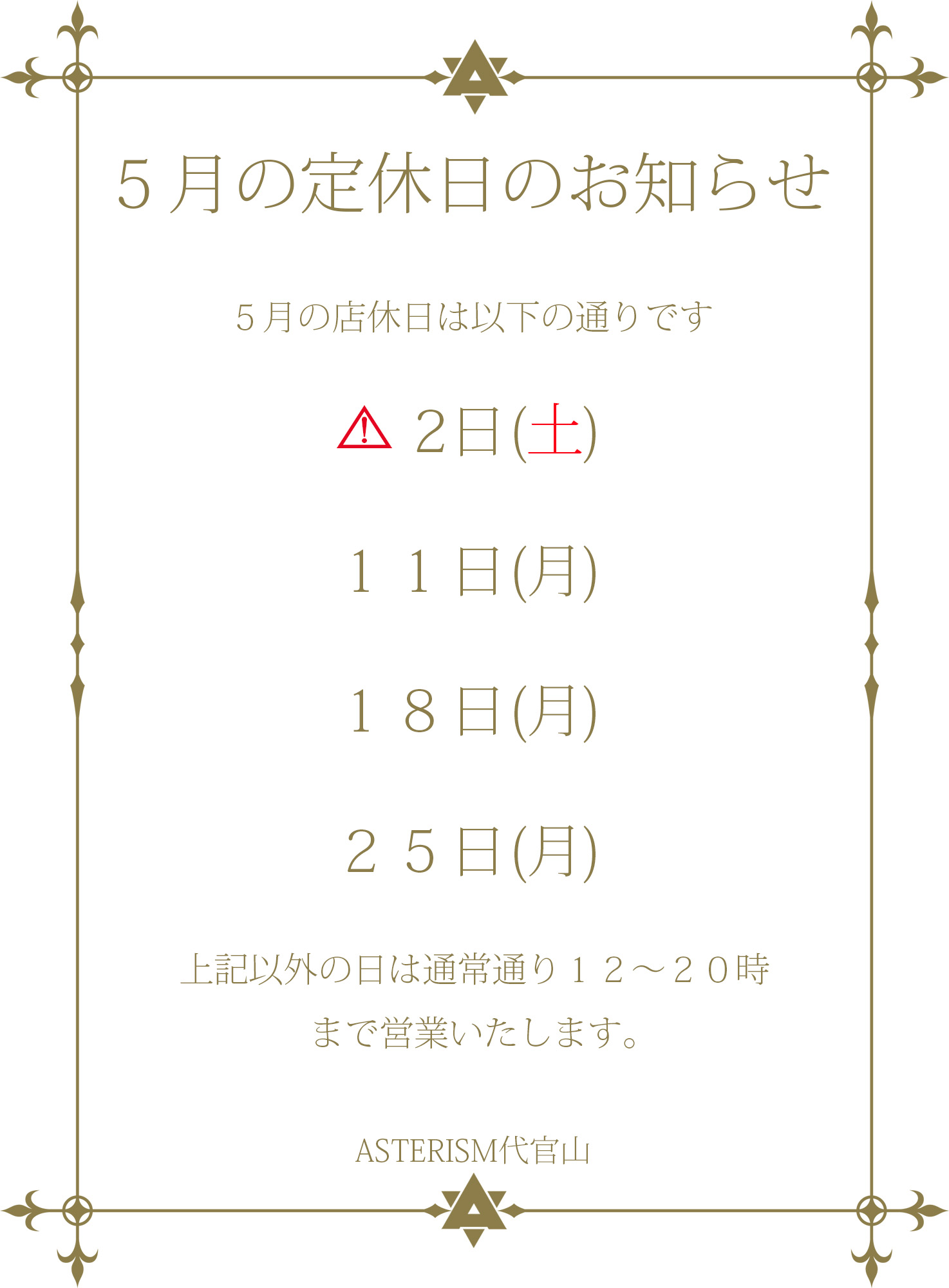 5月は2日(土)、11日(月)、18日(月)、25日(月)がお休みとなります。